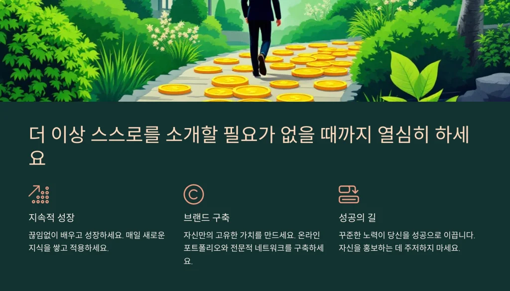 노력은 절대 배신하지 않습니다. 당신의 분야에서 이름을 알리기 위해 끊임없이 배우고 성장하세요. 예를 들어, 매일 자신의 직업과 관련된 새로운 지식을 쌓고, 이를 실전에 적용해보세요. 이러한 노력이 쌓이면 당신의 성과가 스스로를 소개할 것입니다. 꾸준히 배우고, 새로운 도전을 두려워하지 않는 태도가 중요합니다.